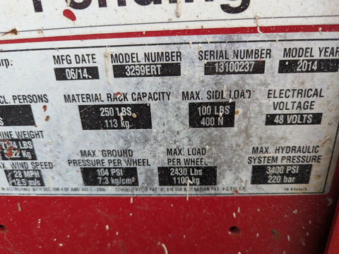 2014 MEC 3259ERT 32' REACH SCISSOR LIFT ELECTRIC ROUGH TERRAIN OUTRIGGERS 265 HOURS STOCK # BF9168549-WIB